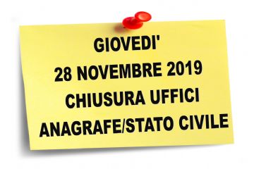 IN DATA 28/11/2019 PER AGGIORNAMENTI TECNICI GLI UFFICI ANAGRAFE /STATO CIVILE SARANNO CHIUSI