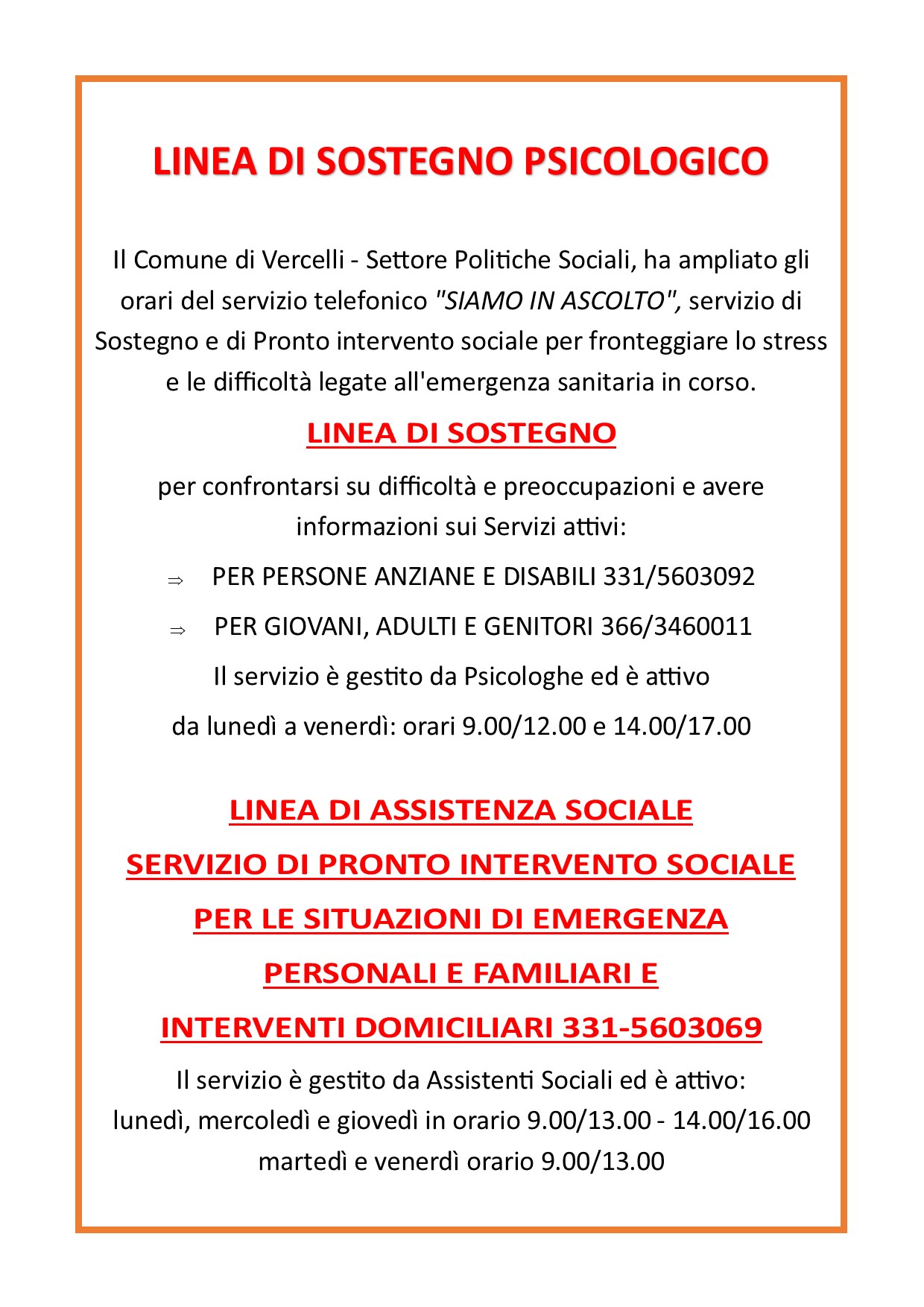 Il Comune di Vercelli - Settore Politiche Sociali, ha ampliato gli orari del servizio telefonico "SIAMO IN ASCOLTO", servizio di Sostegno e di Pronto intervento sociale per fronteggiare lo stress e le difficoltà legate all'emergenza sanitaria in corso.